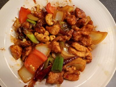 Op basis van thaise saus, paprika, cashewnoten en groenten met rijst