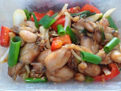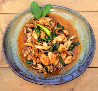 Op basis van oestersaus en groenten met rijst