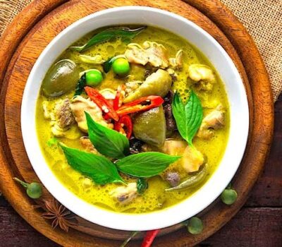 Groene curry met kokosmelk, bamboe, groenten en thaise basilicum en rijst