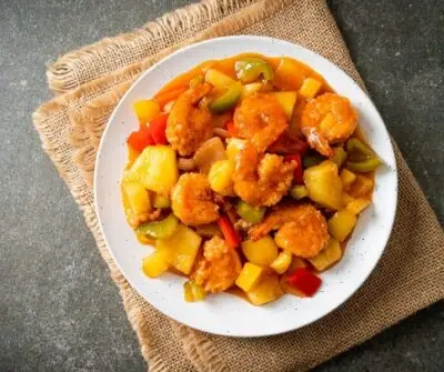 Op basis van zoetzure tomatensaus,paprika, ananas en groenten met rijst