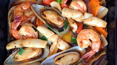 - €20 Met mix van scampi, inktvis en mosselen